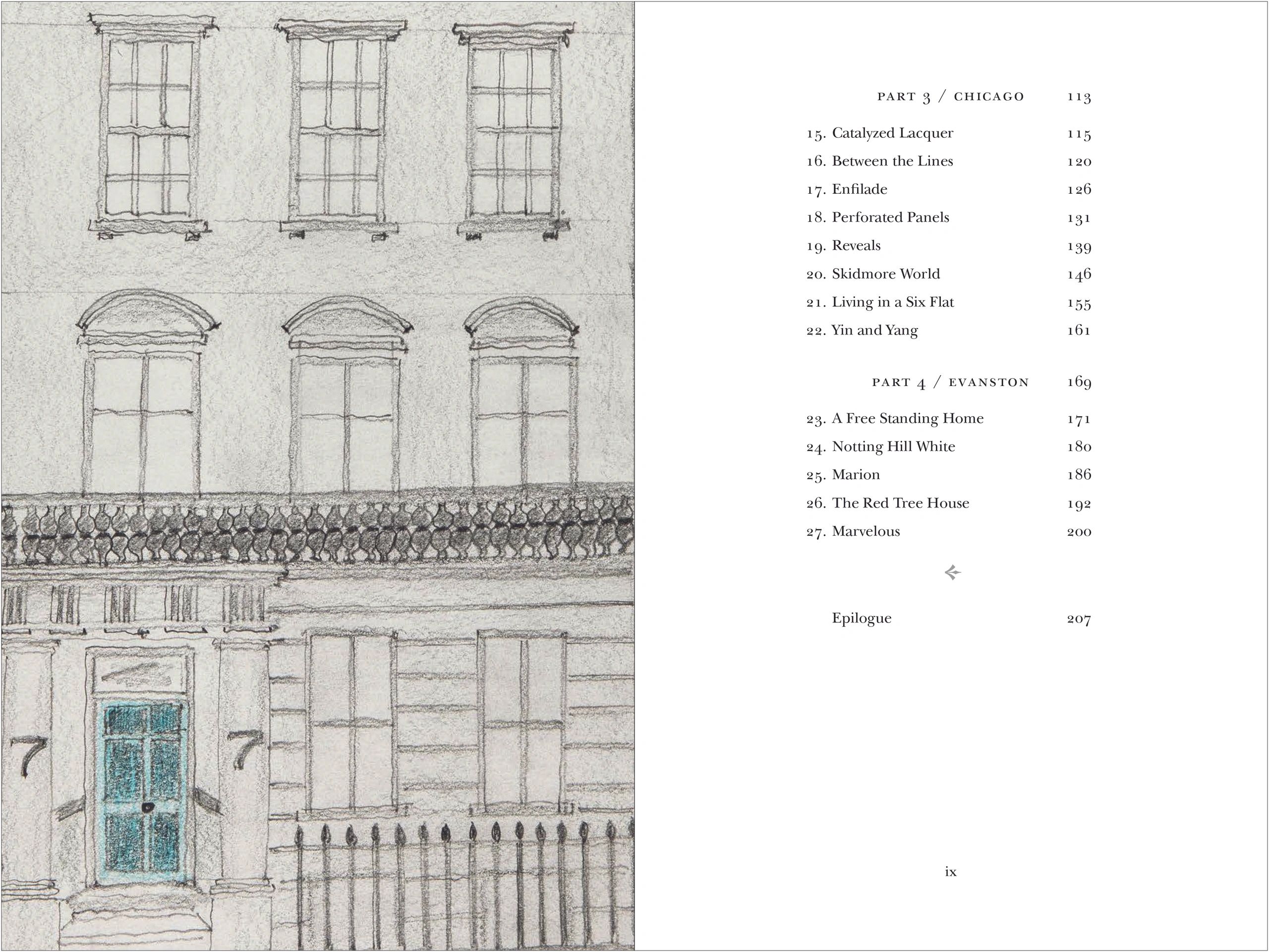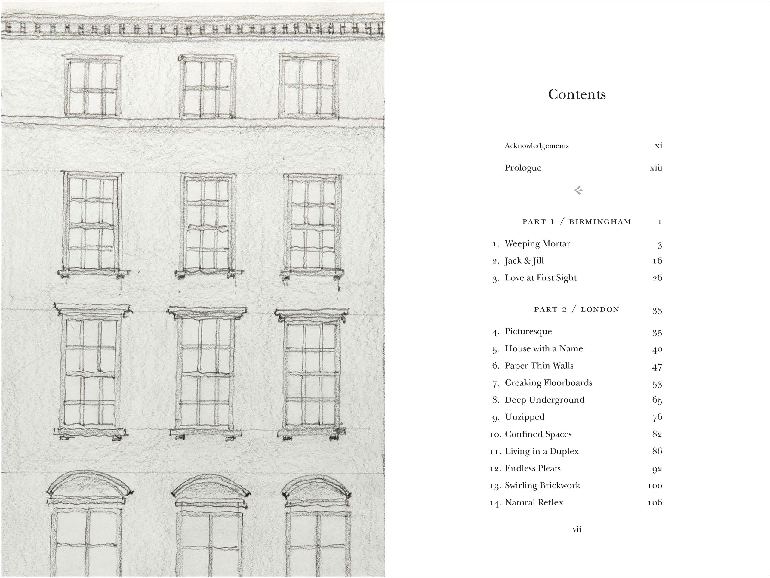 Printed endpapers wrap the book in the texture of David’s hand-drawn floorplans.